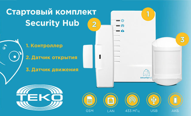 - комплект состоит из абонентского контроллера Security Hub (SH) с аккумуляторной батареей, сетевого адаптера с кабелем USB, радиодатчиков движения и открытия двери/окна с элементами питания. Функционал комплекта расширяется беспроводными датчиками разбития стекла, протечки воды, задымления и др.;